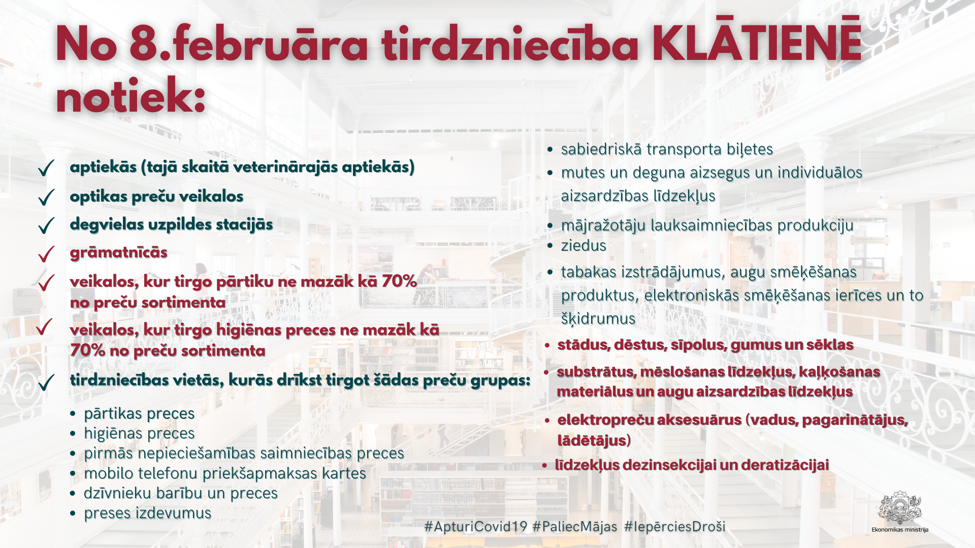 Vienlaikus no š.g. 8. februāra tirdzniecību klātienē ar visu preču sortimentu varēs nodrošināt arī: