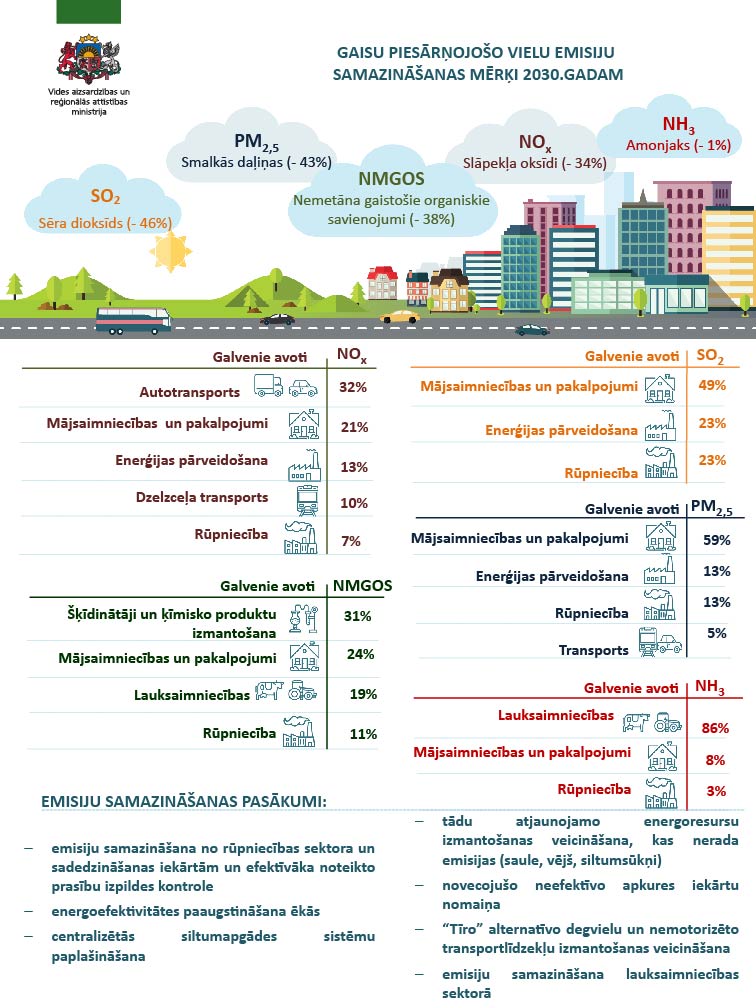 [1] Detalizēta informācija par noteiktajiem gaisa kvalitātes mērķiem noteikta Ministru kabineta noteikumos – MK 2018. gada 2. oktobra noteikumi Nr. 614 “Kopējo gaisu piesārņojošo vielu emisiju samazināšanas un uzskaites noteikumi” un Ministru kabineta 2009.gada 3.novembra noteikumi Nr.1290 “Noteikumi par gaisa kvalitāti