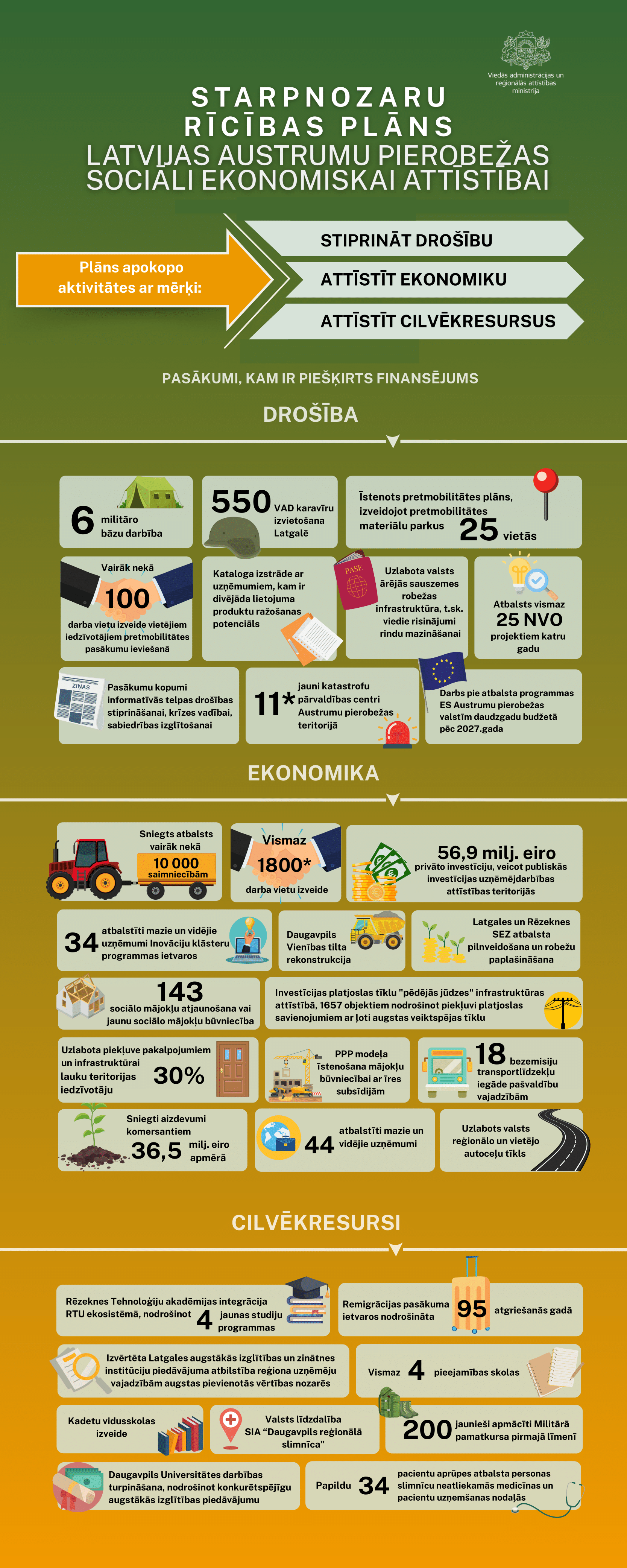Lai stiprinātu Austrumu pierobežas drošību, plāns ietver tādus pasākumus kā 11 jaunu katastrofu pārvaldības centru izbūvēšana Austrumu pierobežas teritorijā (Dagdā, Ilūkstē, Daugavpilī, Līvānos, Viļānos, Alūksnē, Preiļos, Balvos, Krāslavā, Ludzā, Rēzeknē), stiprinot dienestu reaģēšanas spēju. Tajos paredzēts sniegt dažādu institūciju pakalpojumus, t.sk. četros Latgalē papildus paredzētajos centros (Balvos, Krāslavā, Ludzā, Rēzeknē) plānots nodrošināt arī NMPD darbību. Paredzēts īstenot Latvijas Austrumu robežas pretmobilitātes plānu, izveidojot pretmobilitātes materiālu parkus 25 vietās un nodrošinot vairāk kā 100 darba vietas vietējiem iedzīvotājiem. Plāno nodrošināt sešu militāro bāzu darbību - Daugavpilī, Rēzeknē, Lūznavā (Rēzeknes novadā), Preiļu novadā, Meža Mackevičos (Augšdaugavas novadā), Alūksnes novadā - un 550 Valsts aizsardzības dienesta karavīru izvietošanu Latgales reģionā. Ieplānota arī valsts ārējās sauszemes robežas infrastruktūras uzlabošana, iekļaujot trīs robežšķērsošanas vietu - "Terehova", "Grebņeva", "Pāternieki" - infrastruktūras modernizācijas darbus un viedos risinājumus robežu rindu mazināšanai. Papildus ir iecerēts ierīkot ap 200 patvertnes esošo ēku pagrabos un pazemes stāvos atbilstoši vadlīniju vai normatīvo aktu prasībām.